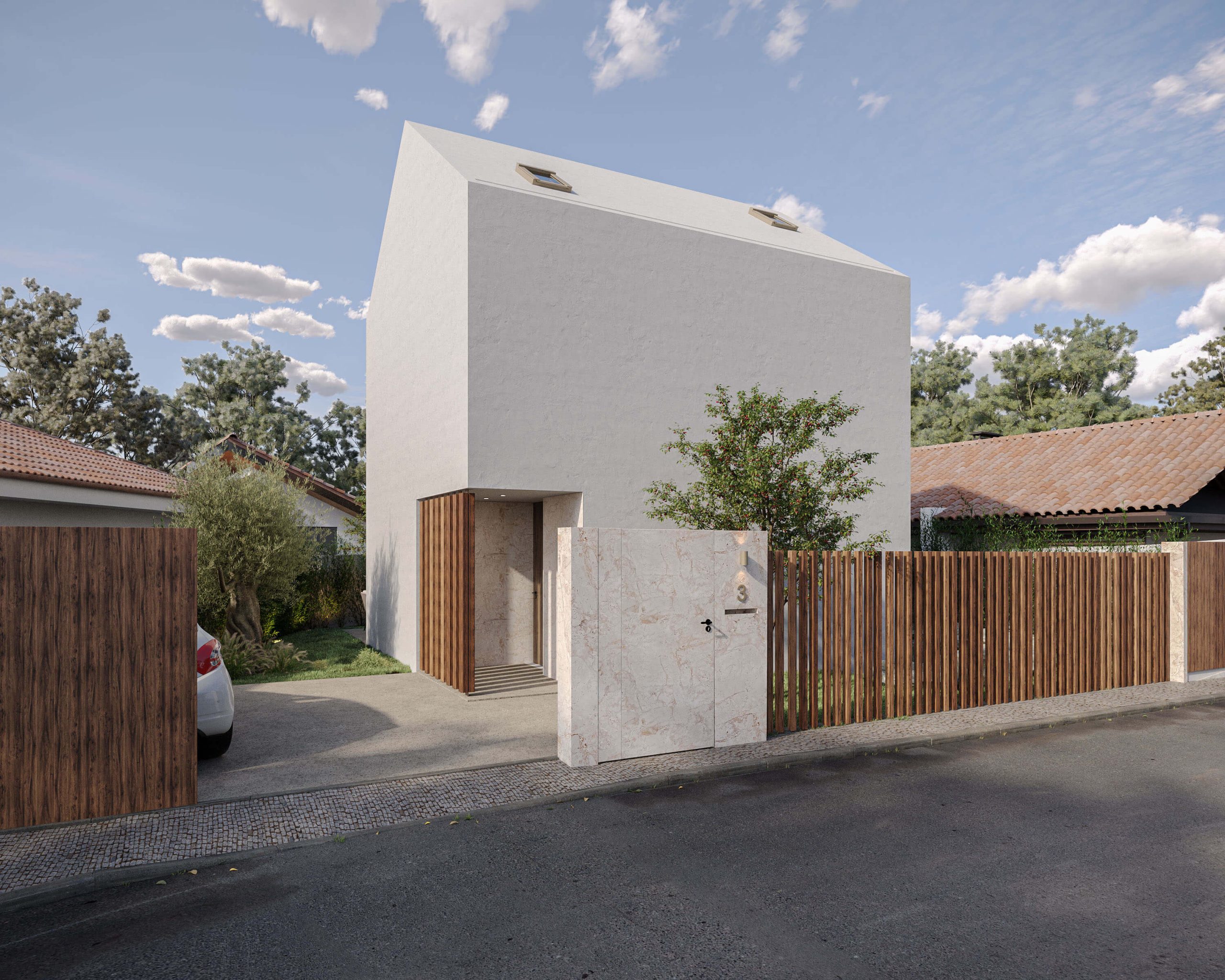 O edifício desenha-se em simetria, como um espelho, criando uma composição equilibrada que permite uma organização eficaz dos espaços e uma leitura clara da sua geometria. As fachadas são revestidas por ripados verticais em perfis metálicos de aço corten, que não só conferem elegância e ritmo como oferecem privacidade, filtrando luz e vistas com delicadeza.