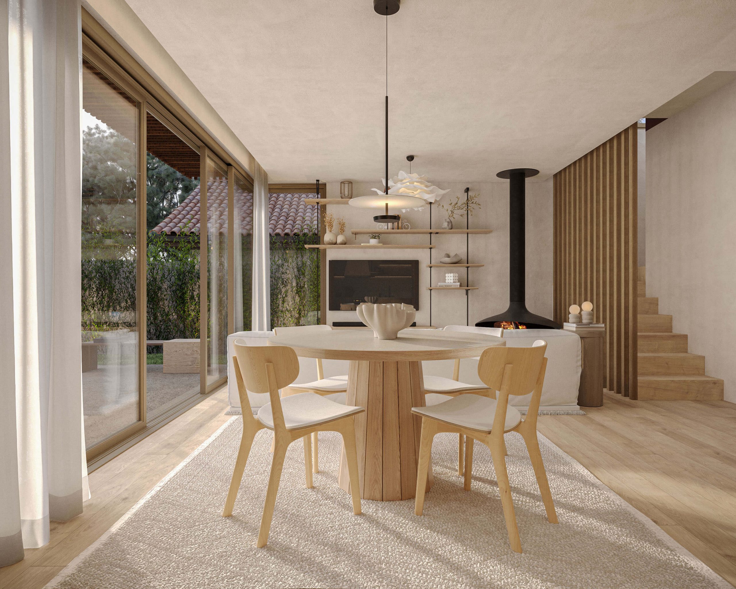 Materials such as stone, wood, and white plaster, combined with a palette of natural tones and clean lines, create a serene and luminous atmosphere. Inside, the high ceilings, large windows, and handcrafted details — like ceramics and exposed beams — enhance the connection between the living space and the surrounding landscape.