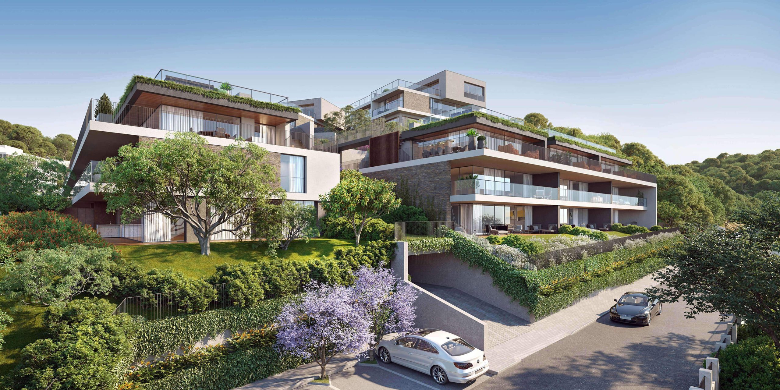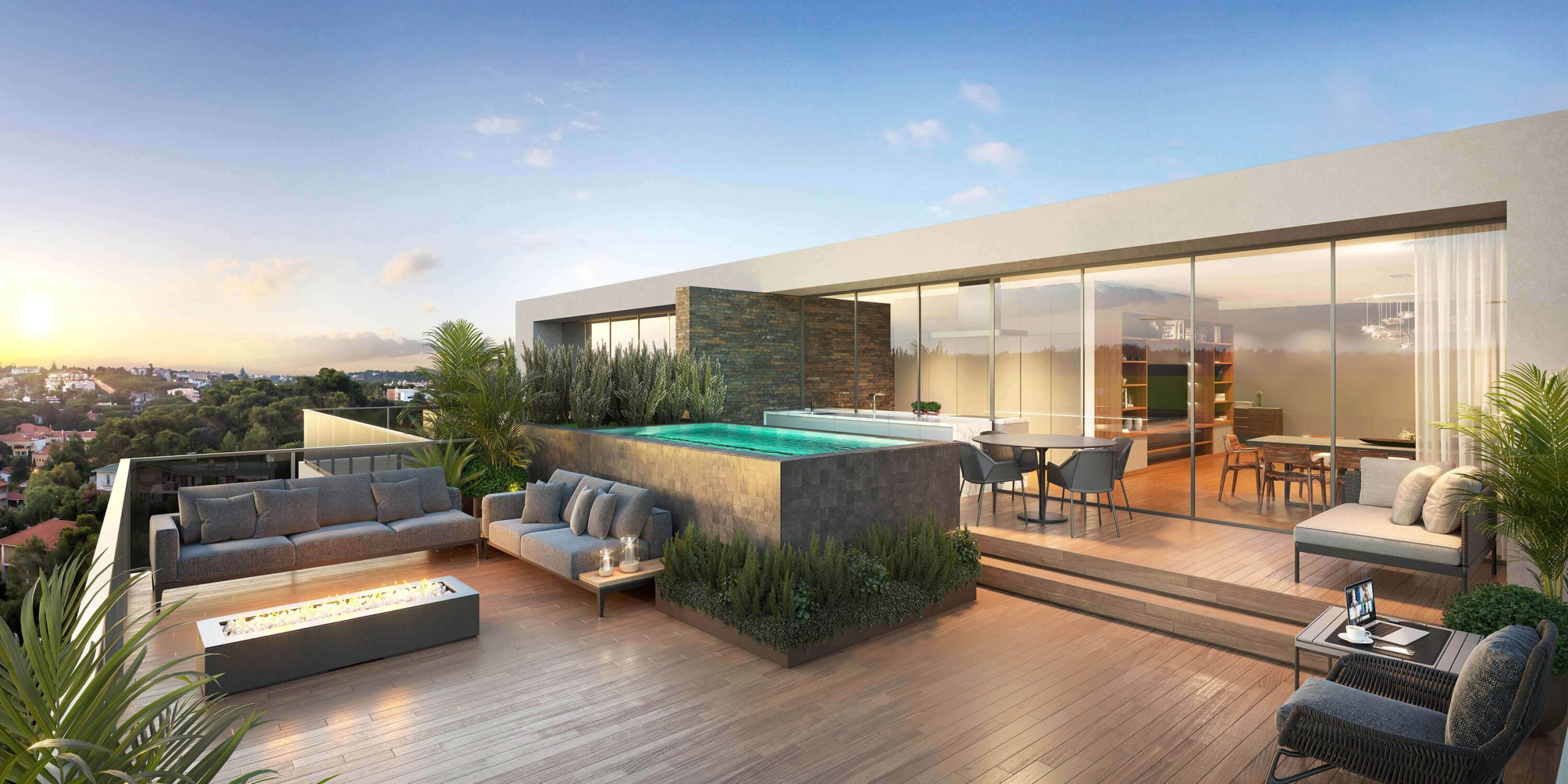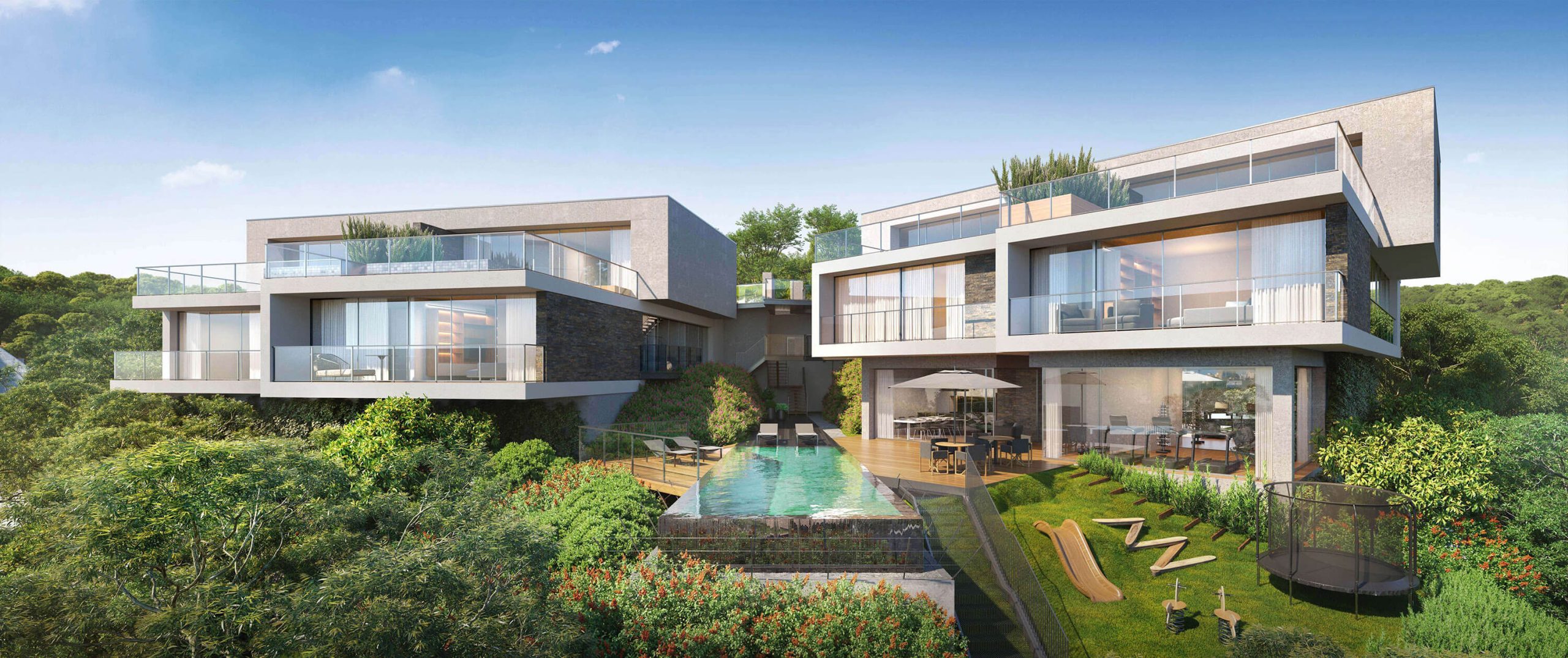 O jardim é uma extensão dos interiores: as frações térreas abrem-se completamente ao exterior, transformando a experiência de habitar num gesto contínuo entre o construído e o natural. Nos pisos superiores, as penthouses elevam o quotidiano, com piscinas em balanço, lareiras exteriores, saunas privadas e vistas amplas sobre a costa. Cada detalhe, da escada em espiral ao elevador privado, foi desenhado para conjugar conforto, funcionalidade e beleza.