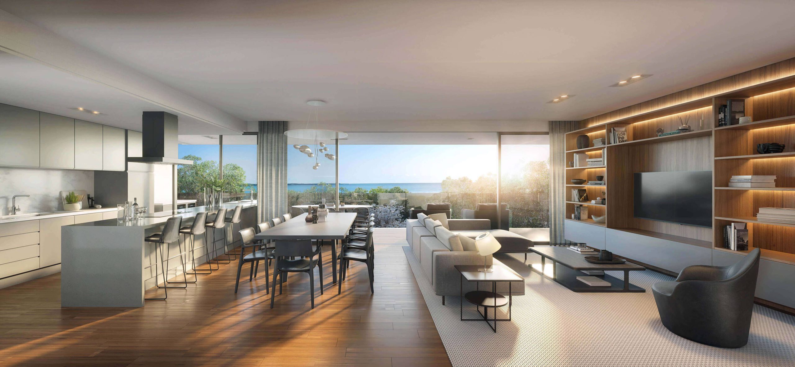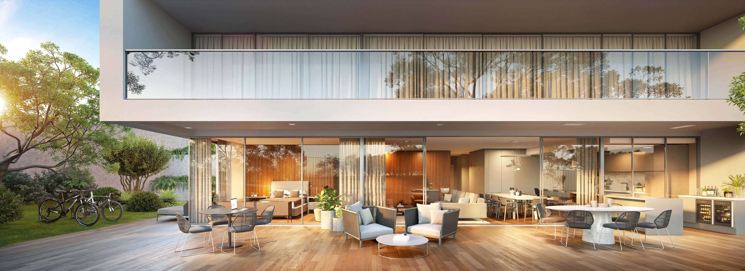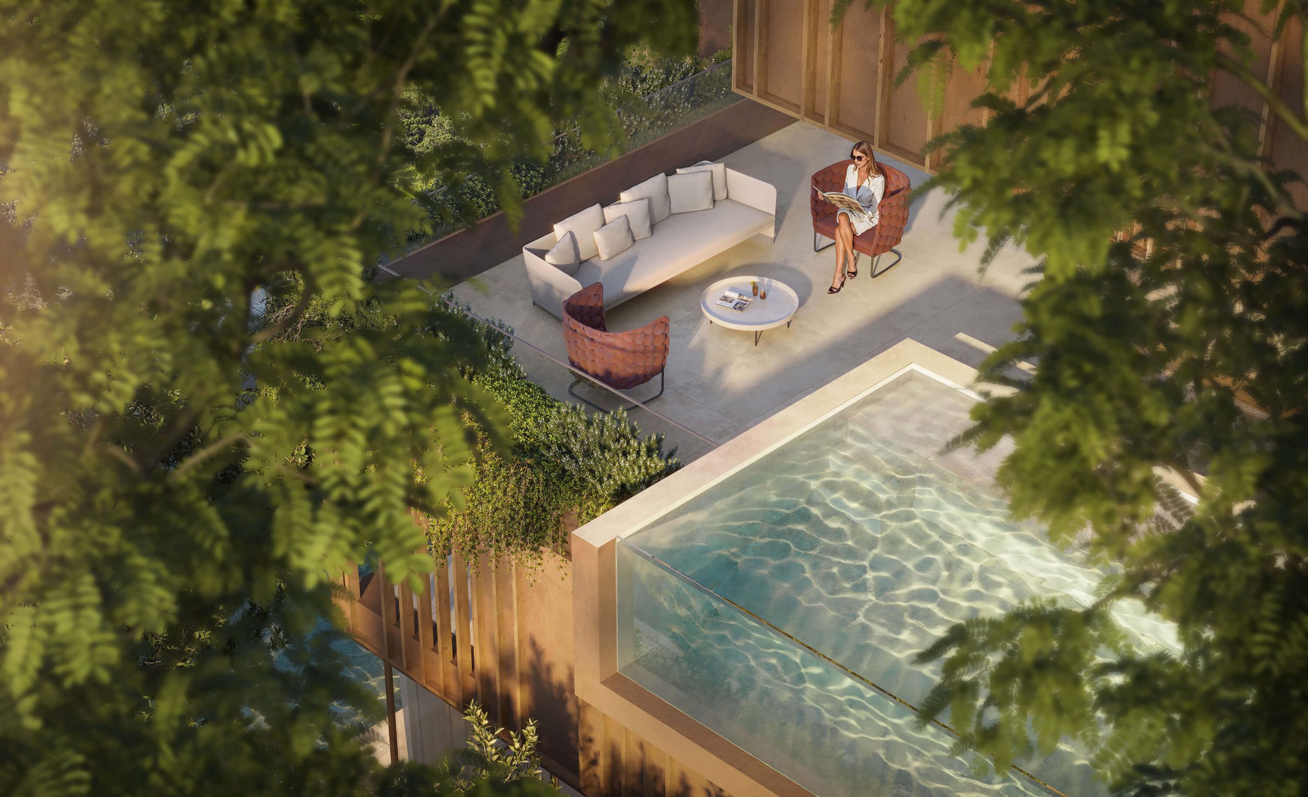 O jardim é uma extensão dos interiores: as frações térreas abrem-se completamente ao exterior, transformando a experiência de habitar num gesto contínuo entre o construído e o natural. Nos pisos superiores, as penthouses elevam o quotidiano, com piscinas em balanço, lareiras exteriores, saunas privadas e vistas amplas sobre a costa. Cada detalhe, da escada em espiral ao elevador privado, foi desenhado para conjugar conforto, funcionalidade e beleza.