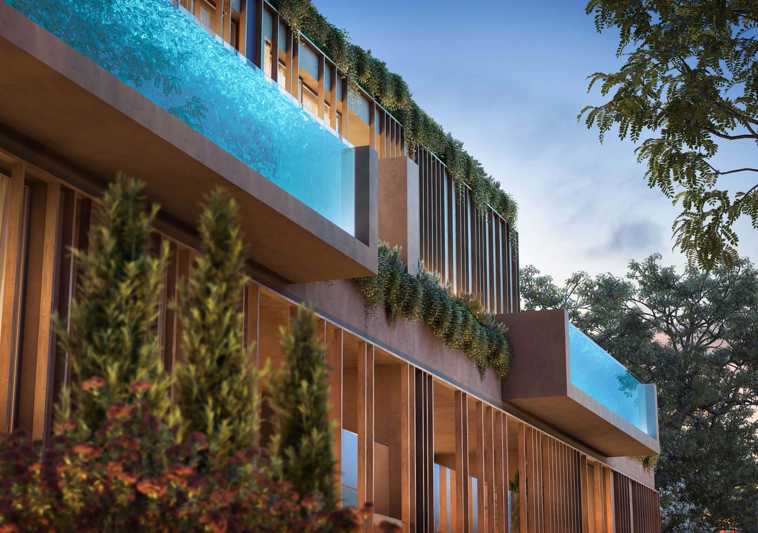 The garden is an extension of the interiors: the ground-floor units open fully to the outdoors, transforming the experience of living into a continuous gesture between the built and the natural. On the upper floors, the penthouses elevate everyday life with cantilevered pools, outdoor fireplaces, private saunas, and expansive views over the coastline. Every detail—from the spiral staircase to the private elevator—has been designed to blend comfort, functionality, and beauty.