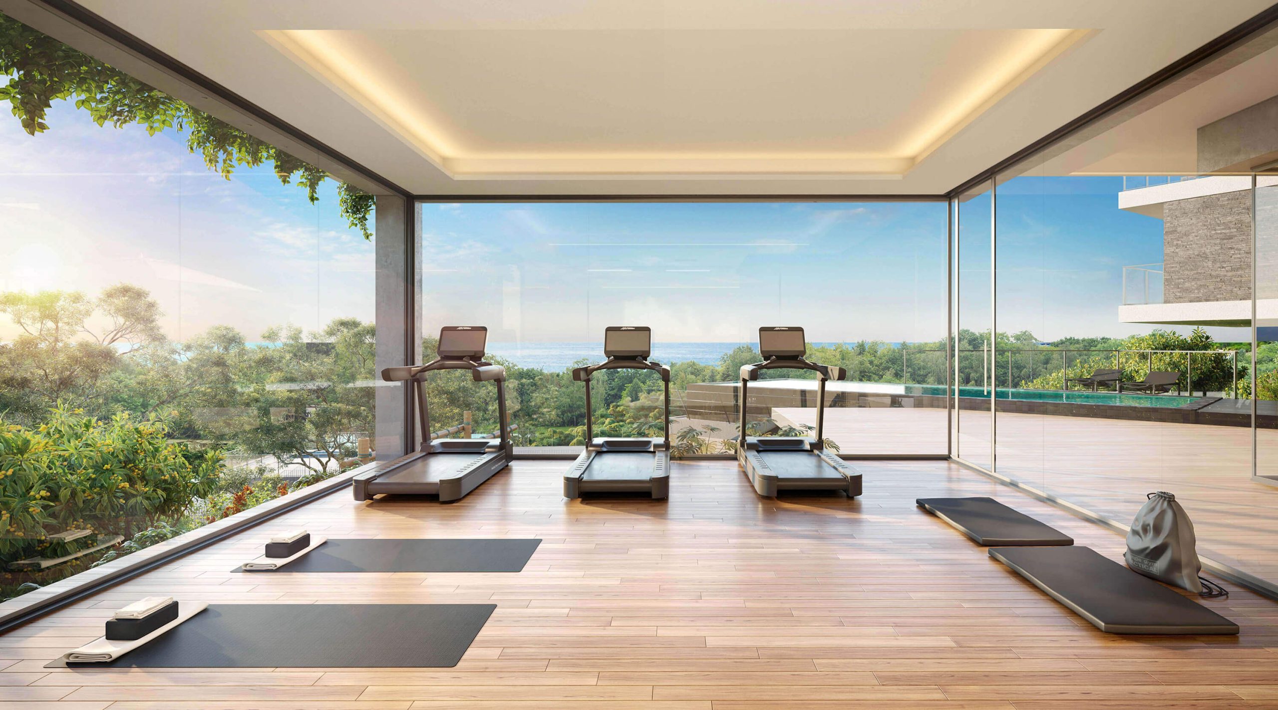 The shared spaces — lobby, gym, gourmet lounge, and infinity pool — extend the living experience, bridging interior and exterior while reinforcing the project’s exclusive character.