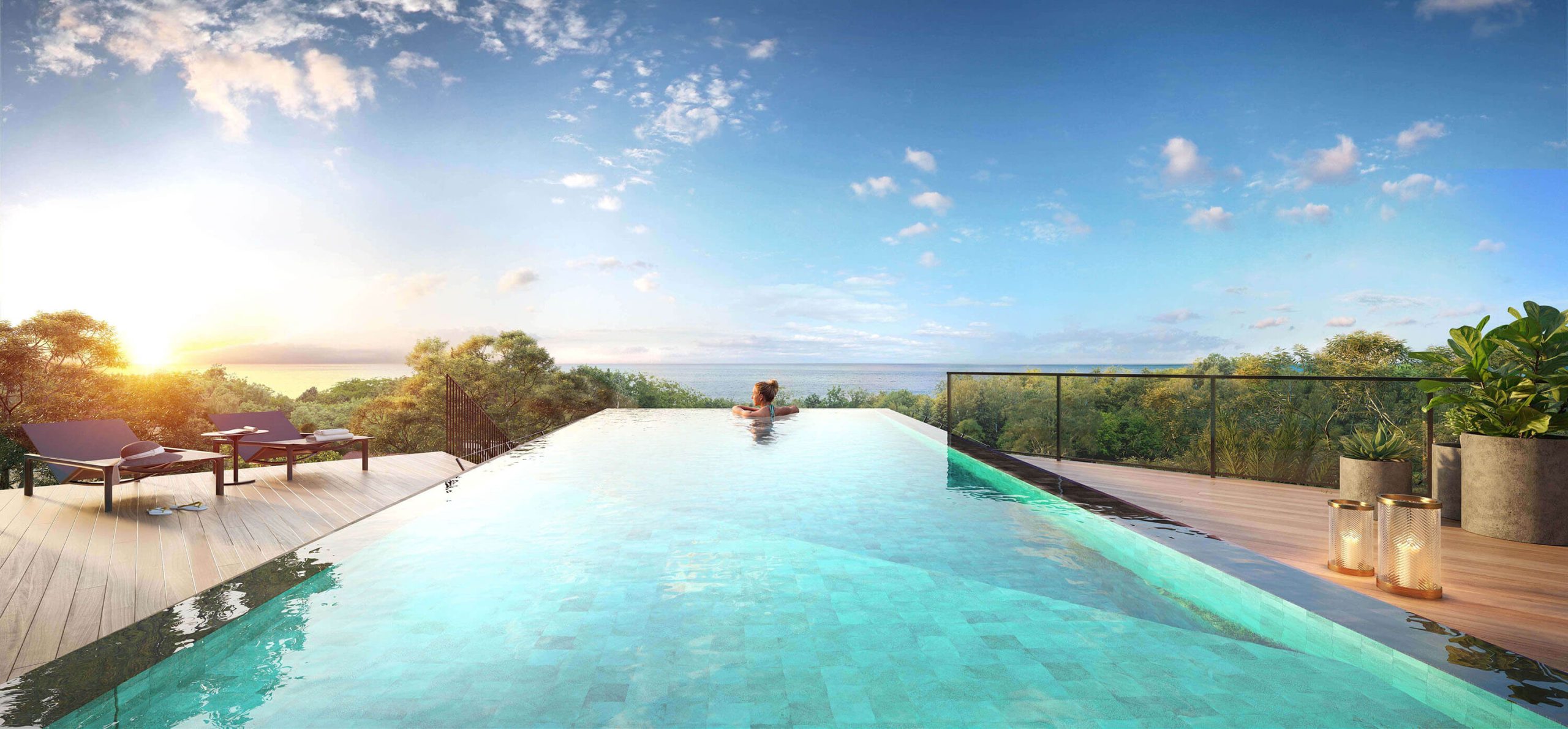 As áreas comuns — lobby, ginásio, gourmet lounge e infinity pool — expandem a experiência de habitar, prolongando o interior para o exterior e reforçando o carácter exclusivo do conjunto.